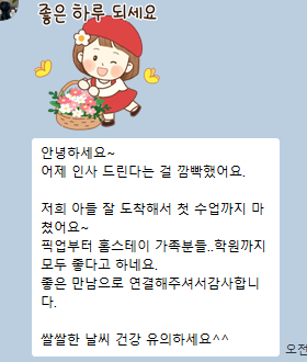 안녕하세요. 심난숙 팀장님! 어제 인사 드린다는 걸 깜빡했어요. 저희 아들 잘 도착해서 첫 수업까지 마쳤어요~ 픽업부터 홈스테이 가족분들..학원까지 모두 좋다고 하네요. 좋은 만남으로 연결해주셔서감사합니다. 쌀쌀한 날씨 건강 유의하세요^^