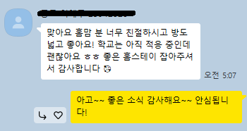 안녕하세요. 박미선 팀장님! 홈맘 분 너무 친절하시고 방도 넓고 좋아요! 학교는 아직 적응 중인데 괜찮아요 ㅎㅎ 좋은 홈스테이 잡아주셔서 감사합니다 🥰