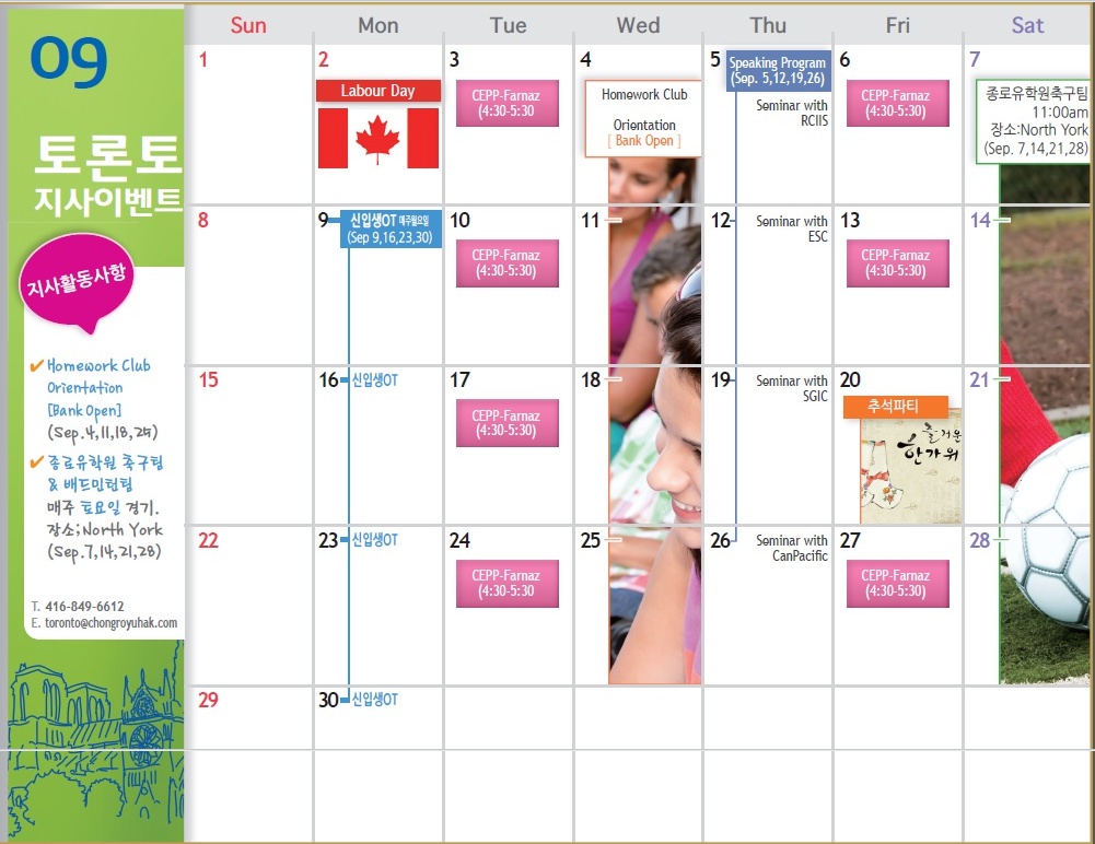 그럼 토론토 지사 9월 엑티비티 캘린더 소개해 드리겠습니다!