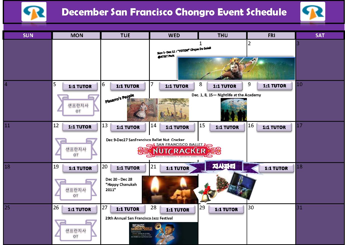 6.Dec. 20 - Dec. 28 - Chanukah begins at sundown on Tuesday, Dec. 20th. Menorah Lighting Ceremony and festivities takes place in Union Square, S.F. late Tuesday afternoon