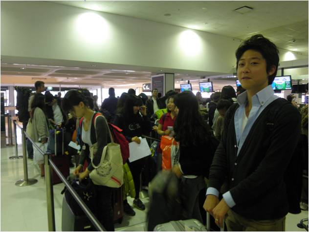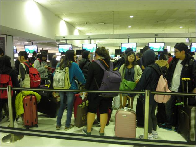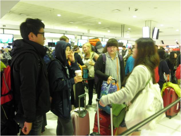 학생들 모두 집에 가기 위해 비행기표 체크인 중입니다.
