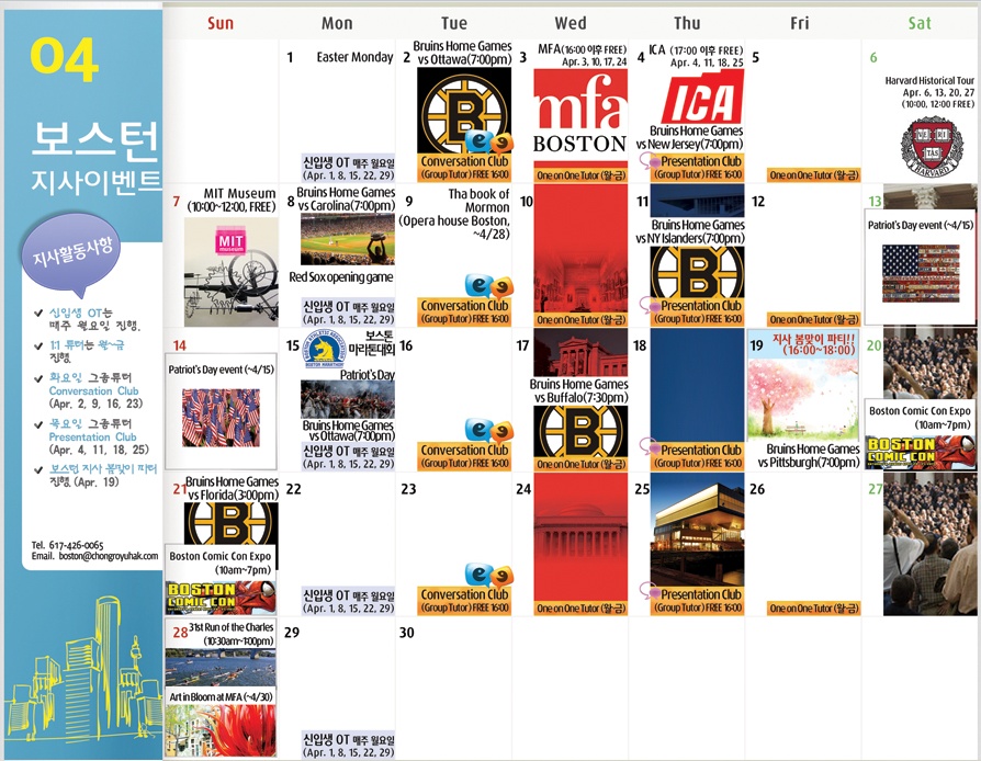 이제 길고 길었던 겨울바람도 잠잠해지고, 따스한 봄 4월이 왔습니다. 따스한 4월의 봄볕도 느껴보시고, 아름다운 보스턴의 거리도 즐겨보며 4월도 성공적인 유학생활이 되시길 바랍니다~ 4월에도 여러분의 즐거운 유학 생활을 위해 보스턴지사는 최선을 다하겠습니다.