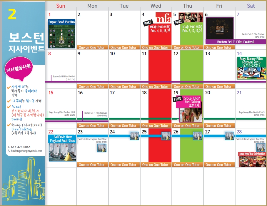 안녕하세요~ 종로유학원 가족 여러분! 벌써 2015년 2월이 다가왔습니다. 1월에 세우셨던 새해 계획은 잘 지켜나가고 계신지요? ^^ 보스턴지사는 2015년에도 종로 가족 분들의 성공적이고 만족스러운 유학생활 되실 수 있도록 2월에도 멈추지 않고 최선을 다하겠습니다.
