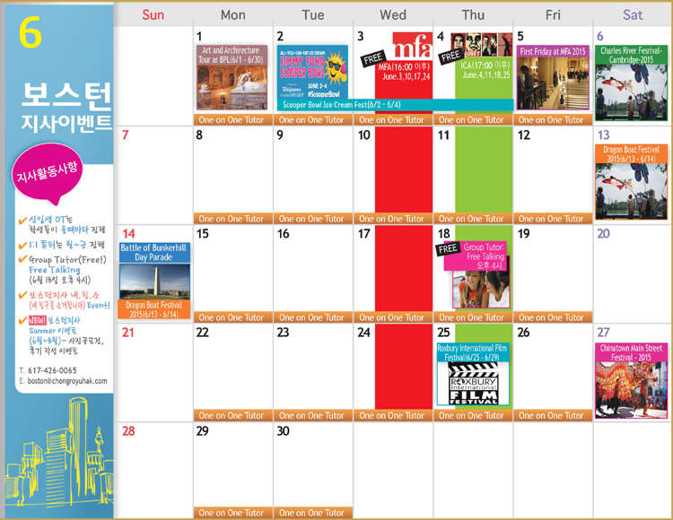 6월에도 우리 보스턴지사에서는 무료 그룹 튜터가 있습니다. 6월 18일에는 원어민 선생님이 알려주시는 생생한 미국 문화와 미국 생활 중 평소 궁금했던 질문에 대해서 자유롭게 이야기 할 수 있고 그룹튜터를 통해서 다른 학생들과 생활정보도 교류하고 친구도 만들 수 있는 좋은 기회입니다! 자리가 한정적이기 때문에 주저하지 마시고 지사로 문의 주세요!