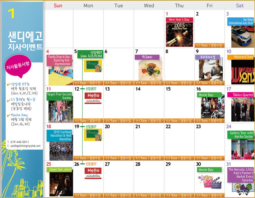 안녕하세요?? 샌디에고 지사입니다. 2014년은 잘 마무리하셨는지요? 다가오는 2015년 새해에도 모두들 건강하시고 새해 복 많이 받으세요^^ 다양한 1월 샌디에고 엑티비티 소식 전해드리겠습니다.