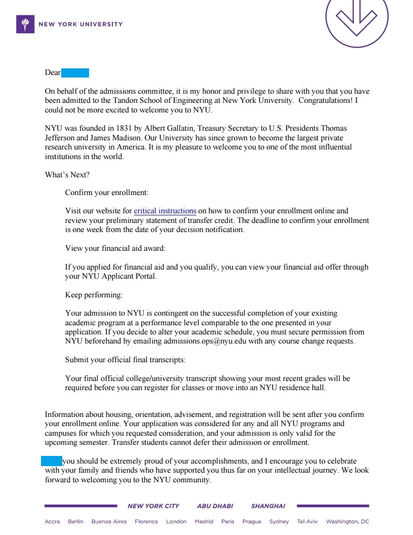 학생은 미국 대학 상위 30위에 속하는 NYU에 입학하기로 했습니다.