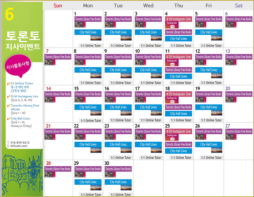 COVID-19사태로 인하여 많은 시민들이 social distancing에 참여하며 그동안 미뤄두었던 취미 생활을 즐기고 있는데요~ Toronto Public Library에서 6월까지 제공하는 무료 eBook 오픈 시스템을 통하여 독서를 해보는 건 어떨까요? 토론토 현지 핸드폰 전화번호를 가진 모든 분들도 무료로 대여가 가능하니, 많은 참여 바랍니다~^^