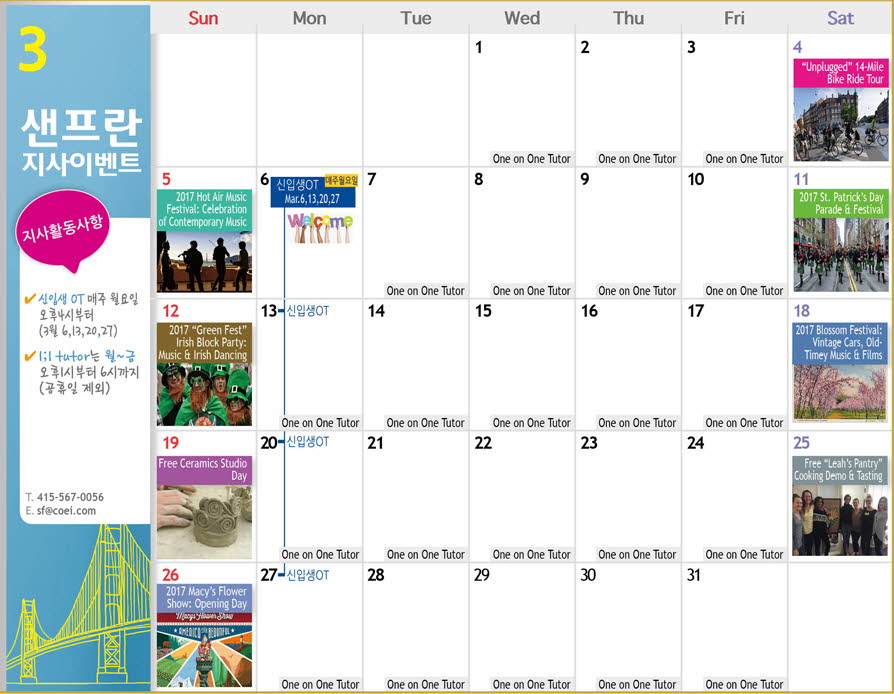 안녕하세요? 샌프란시스코는 점 점 날씨도 좋아지고 봄을 맞이하고 있답니다. 샌프란 전역에서 다양한 행사가 열리니 확인해보시길 바랍니다.