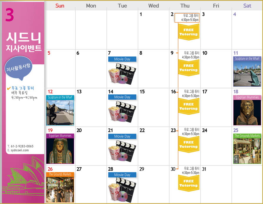 안녕하세요? 시드니지사 3월 Activity Calendar 알려드립니다.