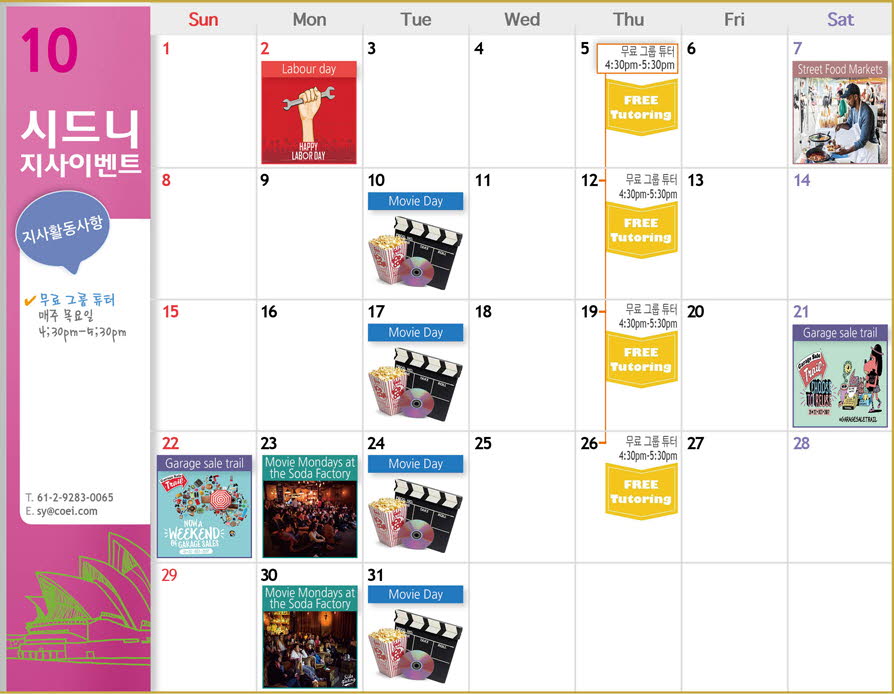 안녕하세요? 시드니지사 10월 Activity Calendar 알려드립니다.