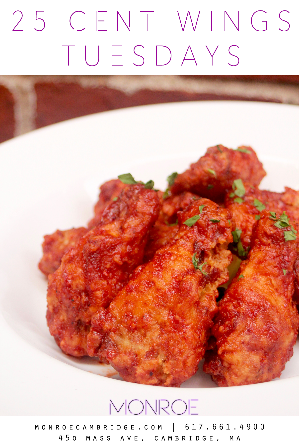 14. 25 Cent Wings Tuesdays 매주 화요일 밤에 MONROE 라는 레스토랑에서 윙 한조각에 25센트로 할인 윙파티가 열립니다. 소스종류도 buffalo, vindaloo, naked, Asian BBQ & smoky habanero 로 여러가지 소스를 고를 수 있으십니다! 자세한 내용은 아래 링크를 참고해주세요. http://www.thebostoncalendar.com/events/25-cent-wings-tuesdays-Nj 장소: MONROE Restaurant, 450 Massachusetts Ave, Cambridge, MA 02139 날짜: 8월9일, 23일 화요일 5:00p – 10:00p (Every Tuesday)