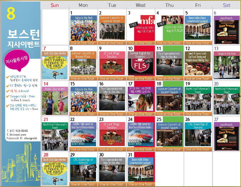 안녕하세요~ 종로유학원 가족 여러분! 보스턴 더위가 절정에 이르는 후끈한 8월이 돌아왔습니다. 실내에서 더위를 피하기보다는 야외에서 무더위를 잊게 해줄 다양한 activity를 즐겨야 진정한 Bostonian이라 할 수 있겠죠? 진정한 보스턴을 만끽할 수 있는 8월에도 보스턴지사는 여러분의 즐겁고 유익한 유학 생활을 위해 최선을 다하겠습니다. 1. 보스턴지사 신입생 오리엔테이션 저희 보스턴지사에서는 보스턴에 도착하신 신입생 분들을 위한 신입생 오리엔테이션이 준비되어 있습니다. 핸드폰 개통, 은행 계좌 개설 등 보스턴 생활 전반부터 학교에 대한 궁금한 사항까지 한번에 안내 받으실수 있으며, 저희 보스턴지사의 각 담당자 분들과 첫 만남을 가지게 됩니다. 성공적인 유학생활 시작의 발판이 되는 보스턴지사 신입생 오리엔테이션에 꼭 참석하세요. 2. 보스턴지사One on One Tutor 보스턴지사 원어민 선생님과 짜릿하면서 신나는 영어 공부 어떠세요? 저렴하면서 알찬1:1 개인 교습으로 영어에 한걸음 더 다가서 보세요. 효과적인 수업 방법과 학생마다 다른 개인별 1:1 맞춤교육은 여러분의 영어실력을 쑥쑥 향상시키실 수 있습니다. 3. 내.친.소 (내 친구를 소개합니다!) 이벤트 숙소 때문에 고민하는 친구? 영어가 늘지 않아 고민이 되는 친구? 새로운 학원을 가고 싶은 친구? 미국에서 대학 또는 대학원 진학을 꿈꾸는 친구? 보스턴 지사에서는 이 모든 고민을 시원하게 해결해드립니다! 이벤트 관련 궁금하신 사항은 지사방문, 전화 또는 이메일로 문의해 주세요. 친구 소개 이벤트 참여하고 상품권 받아가세요~ ^^ Tel. 617-426-0065 | Email: bt@coei.com | Kakaotalk ID: chongrobt 4. Chongro Café - Free Coffee & Snack! 보스턴지사로 오셔서 학교 상담도 받고 에너지도 충전하세요. 타 유학원 학생, 외국인 학생도 언제나 환영 입니다! 5. Job 인터뷰 체험 이벤트 - Free Job 인터뷰 체험 이벤트 - Free 아마 많은 학생 여러분들께서 취직에 대해서 많이 고민하고 생각하실텐데요, 보스턴지사에서 Job인터뷰 체험 이벤트를 준비했습니다. Job 인터뷰시 주의사항, 팁, 그리고 경험담 등을 통해 조금 더 준비되고 자신감 있는 Job 인터뷰 실력을 키울 수 있는 기회입니다! ^^ 보스턴지사의 전문적인 튜터 선생님과 진행되는 이번 Job 인터뷰 체험 이벤트! 후회하지 않을 선택이 되시리라 확신합니다. 8월17일 수요일 오후 3시에 진행되고 선착순으로 참석자를 모집하니 서둘러 신청해 주세요! 6. Museum of Fine Arts – Free Day 매주 수요일, 오후 4시 이후에는 세계 4대 박물관 중 하나인 Museum of Fine Arts (Green Line: Museum of Fine Arts Station / Orange Line: Ruggles Station) 입장료가 자율적인 기부로 운영됩니다. 관심 있으신 분은 링크를 참조해 주세요.