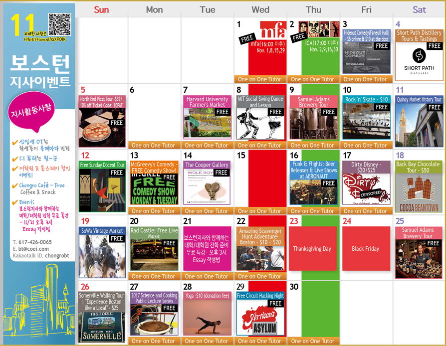 형형색색 깊어가는 보스턴의 아름다운 가을을 감상하시며 꿈과 싱그러움으로 가득했던 여름의 추억들을 가을의 수확으로 이어가는 풍성한 11월이 되시길 바랍니다. 여러분의 수확이 더욱 풍성해질 수 있도록, 보스턴에서 즐겁고 유익한 유학생활을 할 수 있도록 보스턴지사는 11월에도 함께 하겠습니다.