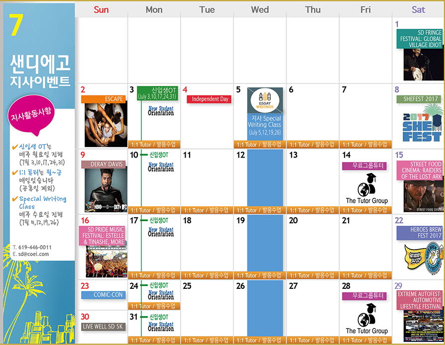 안녕하세요 샌디에고 7월 액티비티 캘린더 안내드립니다~