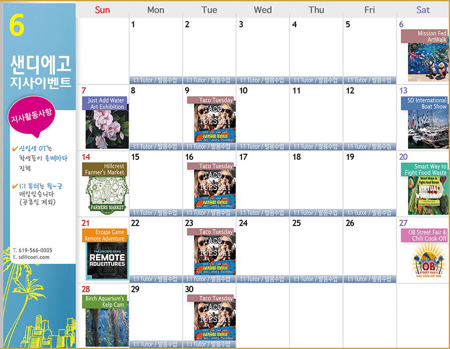 * COVID-19 으로 연기/취소된 이벤트가 있을 수 있으니 자세한 사항은 샌디에고 지사로 문의 주세요