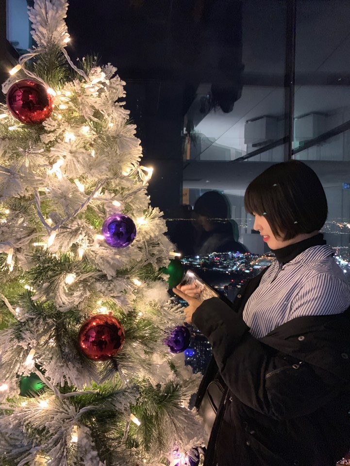 크리스마스 트리도 있어서 친구가 사진찍어줬어요 다 통유리로 되어 있어서 어느쪽으로 가든 야경이 한눈에 다보여요! 꼭 가보세요