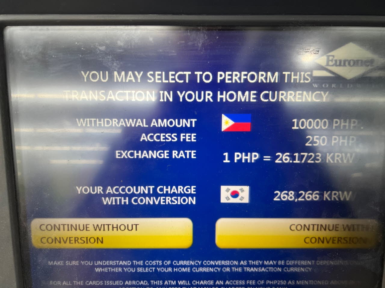 최대로 많이 뽑을수 있는 금액이 10,000 PHP 여서10,000 PHP 의 250 PHP 정도면 음.. 5천원 정도니까