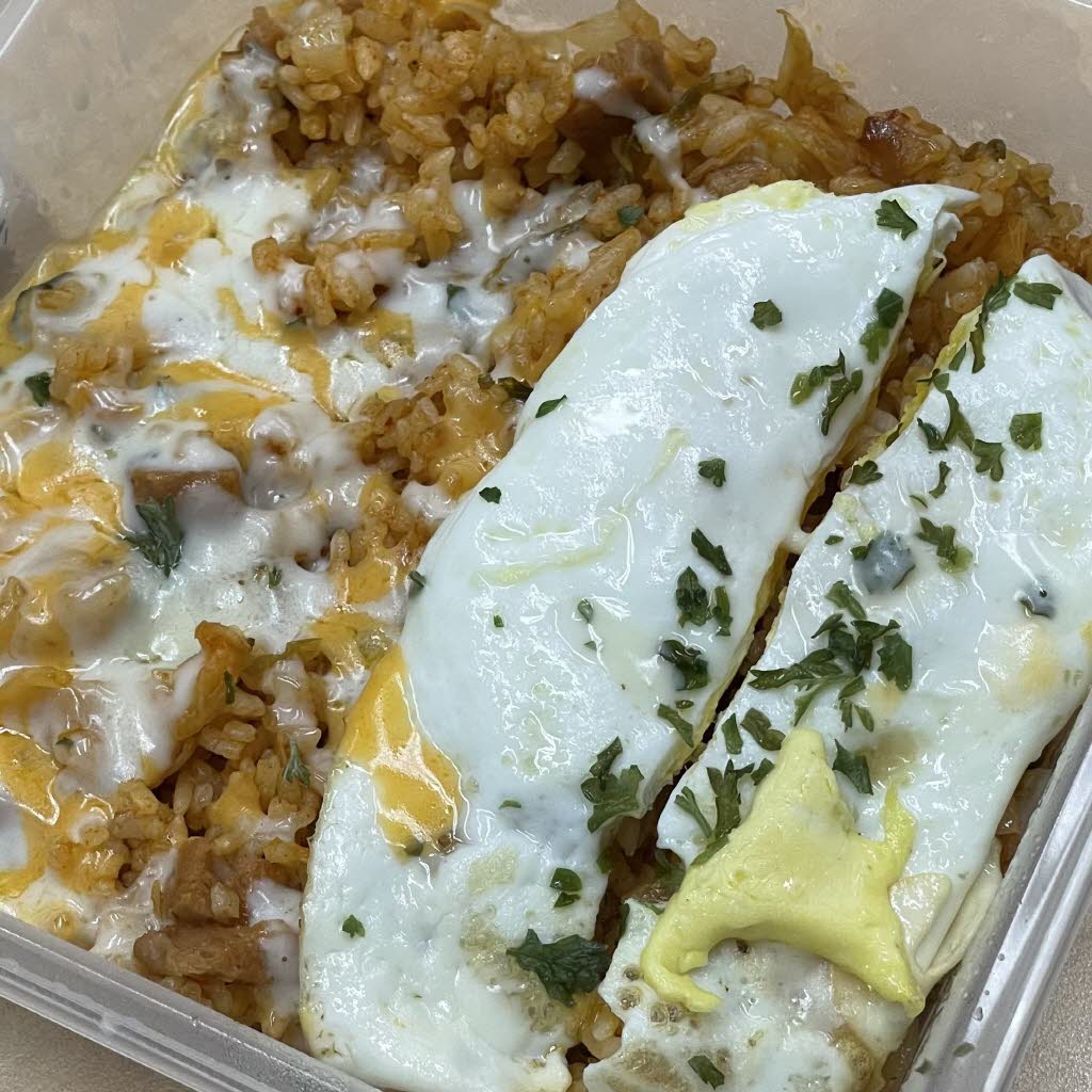 사진은 김치볶음밥인데 대량으로 만들어놓기 편해서 점심은 주로 볶음밥류로 많이 싸갔어요.