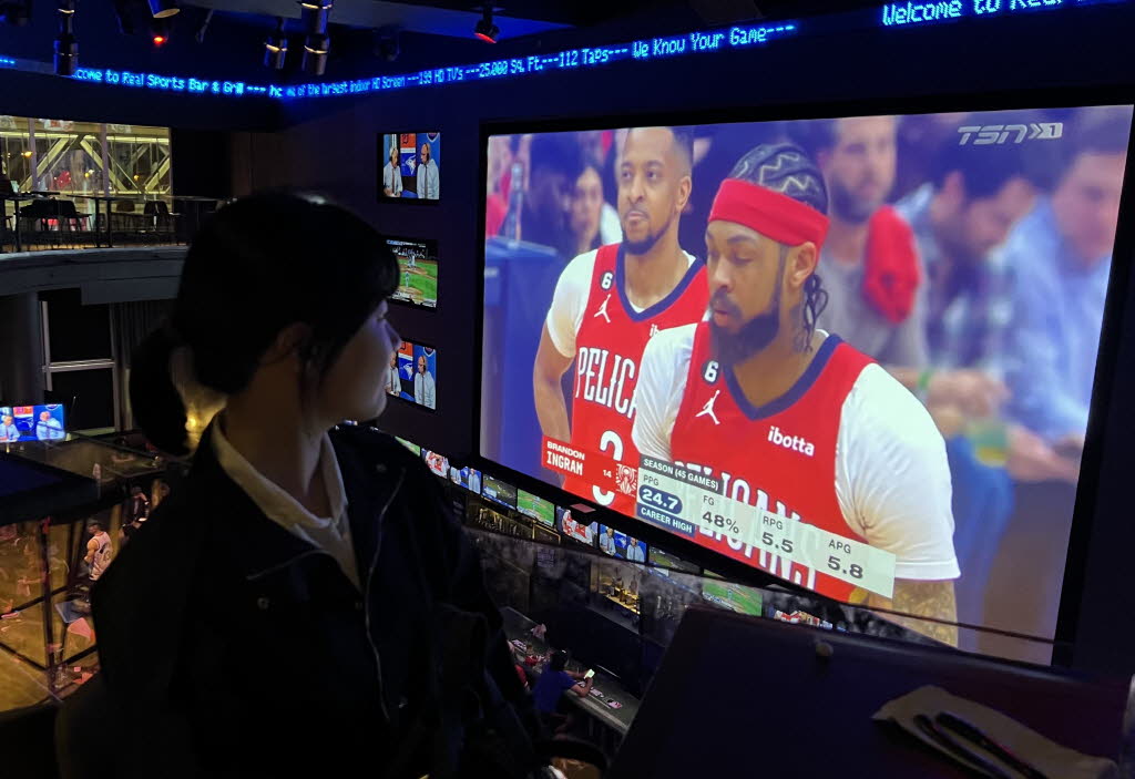 여기가 스포츠 경기를 엄청 큰 전광판에 틀어주는 펍 같은 곳인데요, 제가 간 날은 농구 경기가 있었습니다.