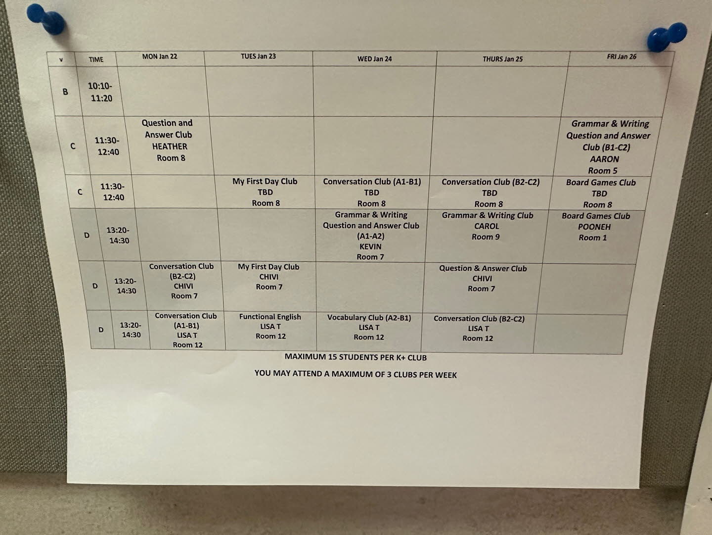 (수업을 바꾸기 위해서는 라운지로 들어가는 부분에 request 를 할 수 있는 책상이 있어요. 거기에 학번, 이름, 지금 수업, 바꾸고 싶은 수업, 레벨을 적으시면 승인이 될 시 다음주 화요일부터 바뀌게 돼요).