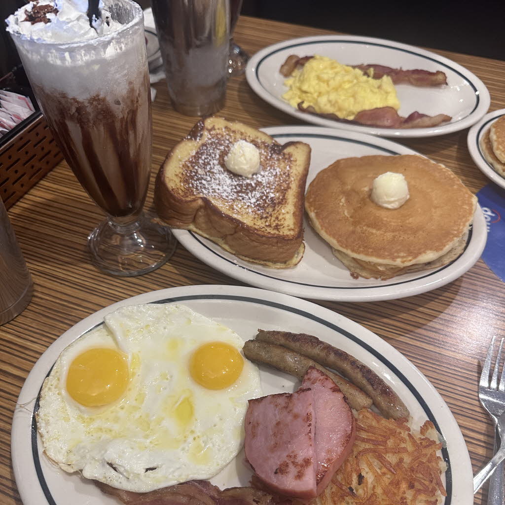 '정통 미국 아침식사' 하면 떠오르는 팬케이크, 오믈렛, 베이컨 등등을 팔고 있어요.