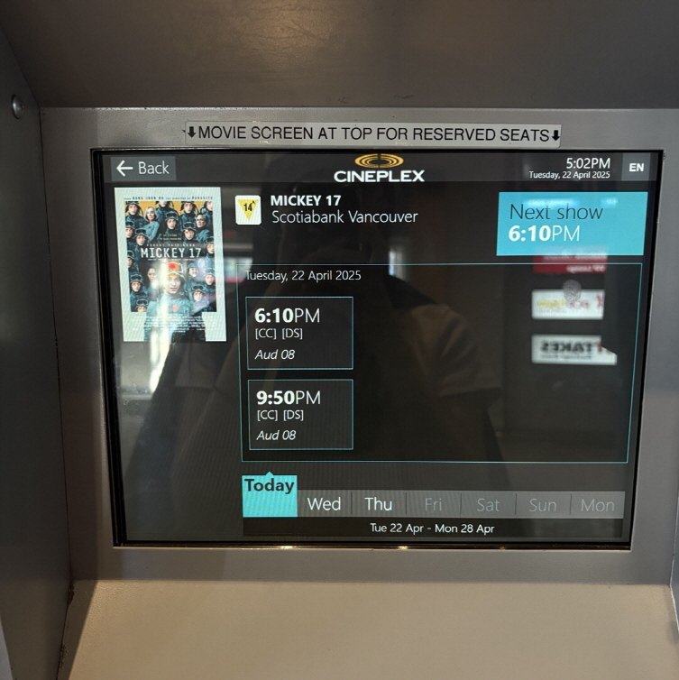 그래서 친구와 함께 다운타운 근처의 극장으로 향했어요. 온라인으로 미리예매할 수도 있지만, 저는 무인 발권기를 이용해서 현장에서 바로 발권했어요.