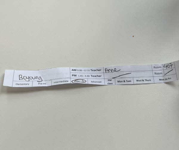 첫날에는 리스닝과 문법 테스트, 일대일 구두 테스트를 통해 적절한 반이 배정됩니다.
