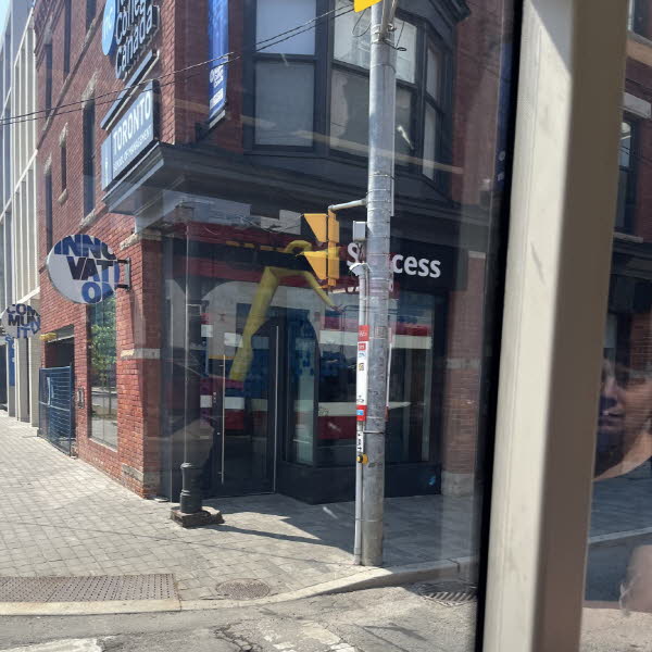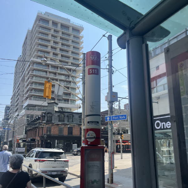 정류장은 TTC 로고가 있는 얇은 기둥 표지판으로 쉽게 찾을 수 있어요.