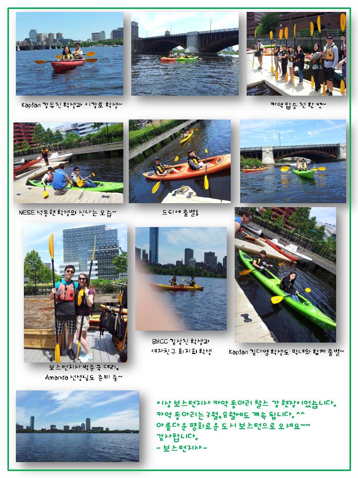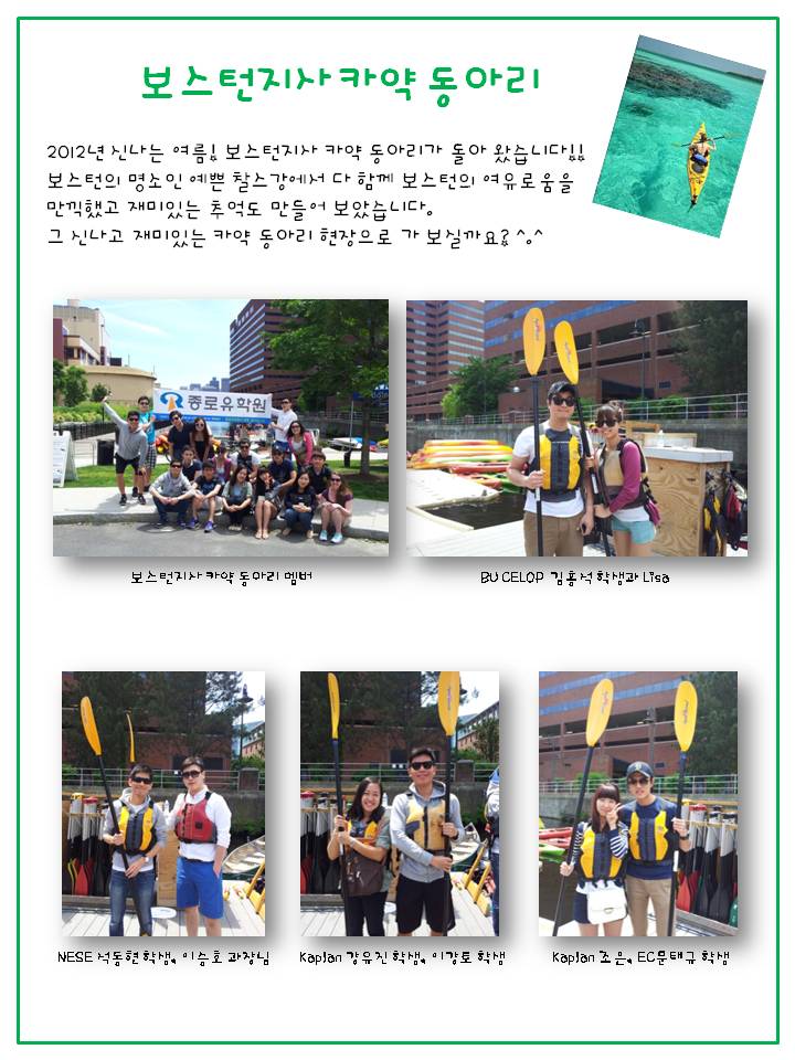 2012년 신나는 여름!  보스턴 지사 카약 동아리가 돌아 왔습니다~~~  보스턴의 명소인 찰스강에서 다 함께 보스턴의 여유로움을 만끽했고 재미있는 추억도 만들었지요^^