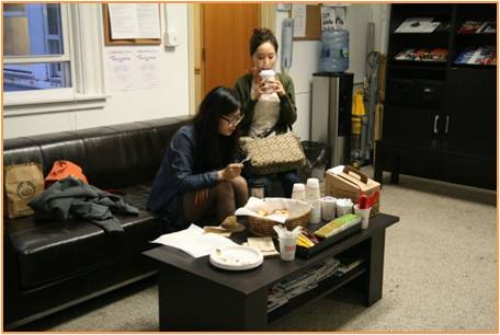 KA-Harvard에 다니는 박형준 학생과 KA-NEU에 다니는 다정하게 도넛과 커피를 함께 하고 있는 KA-NEU,