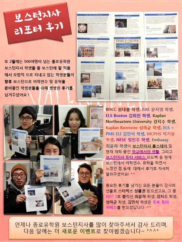 안녕하세요? 종로유학원 가족 및 친구들 여러분! 2014년 2월 보스턴지사에서는 발렌타인데이 기념 이벤트와 보스턴지사 리포터 이벤트가 열렸답니다!