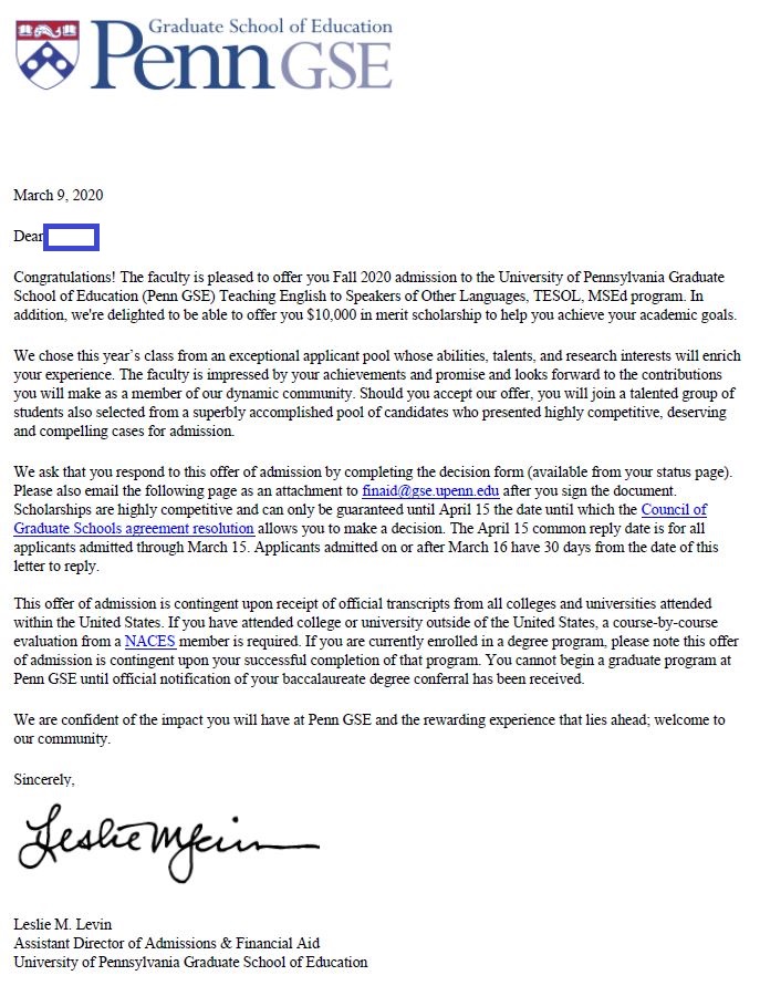 교육학 전미랭킹 2위의 University of Pennsylvania 대학교 MSEd TESOL 과정에 합격하였으며 장학금 $10,000 offer 도 받았습니다!!!