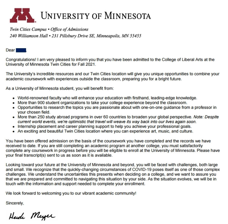 전미랭킹 66위, 주립대 랭킹 26위의 명문 주립대인 미네소타 대학에 합격하였습니다. 진심으로 축하드립니다!