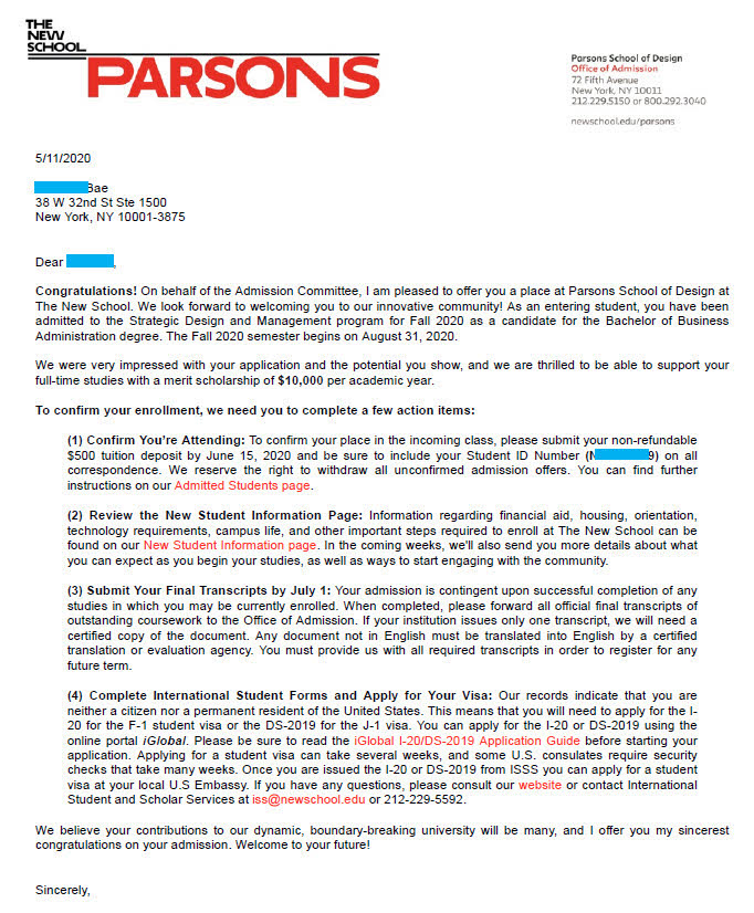 장학금 $10,000 과 함께 Parsons School of Design 의 Strategic Design and Management 석사 과정으로 합격하였습니다. 합격을 축하드립니다.!