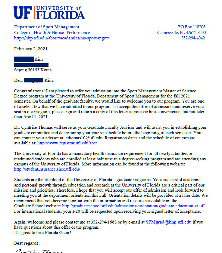 University of Florida 의 스포츠 경영학 석사 과정 (MS in Sports Management) 에 합격하였습니다. 진심으로 축하드립니다!