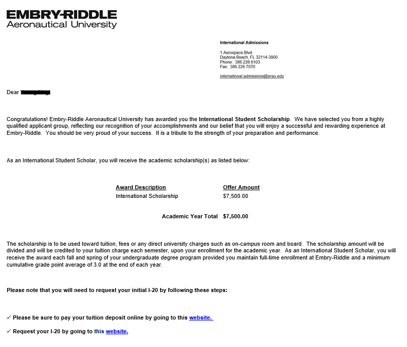 Embry-Riddle Aeronautical University 합격 (장학금 $7,500)