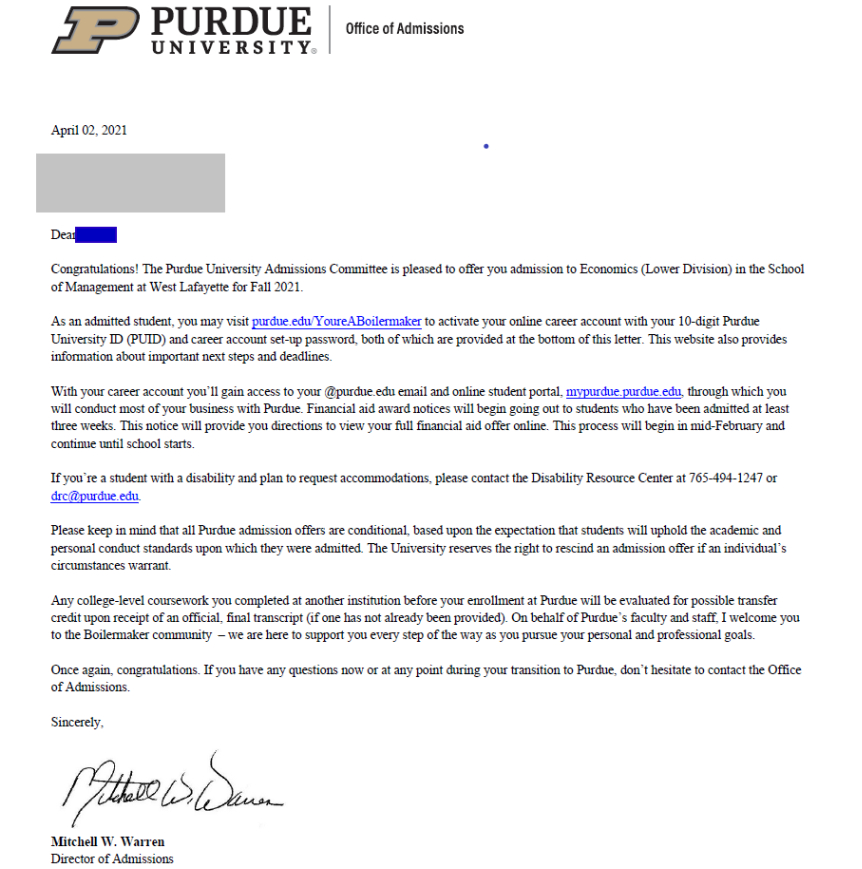 명문주립대학교인 Purdue University 의 Economics 전공으로 합격하였습니다. 퍼듀 대학의 Krannert School of Management 는 전미랭킹 24위(USNEWS 2021) 의 대학입니다. 합격을 축하드립니다.!