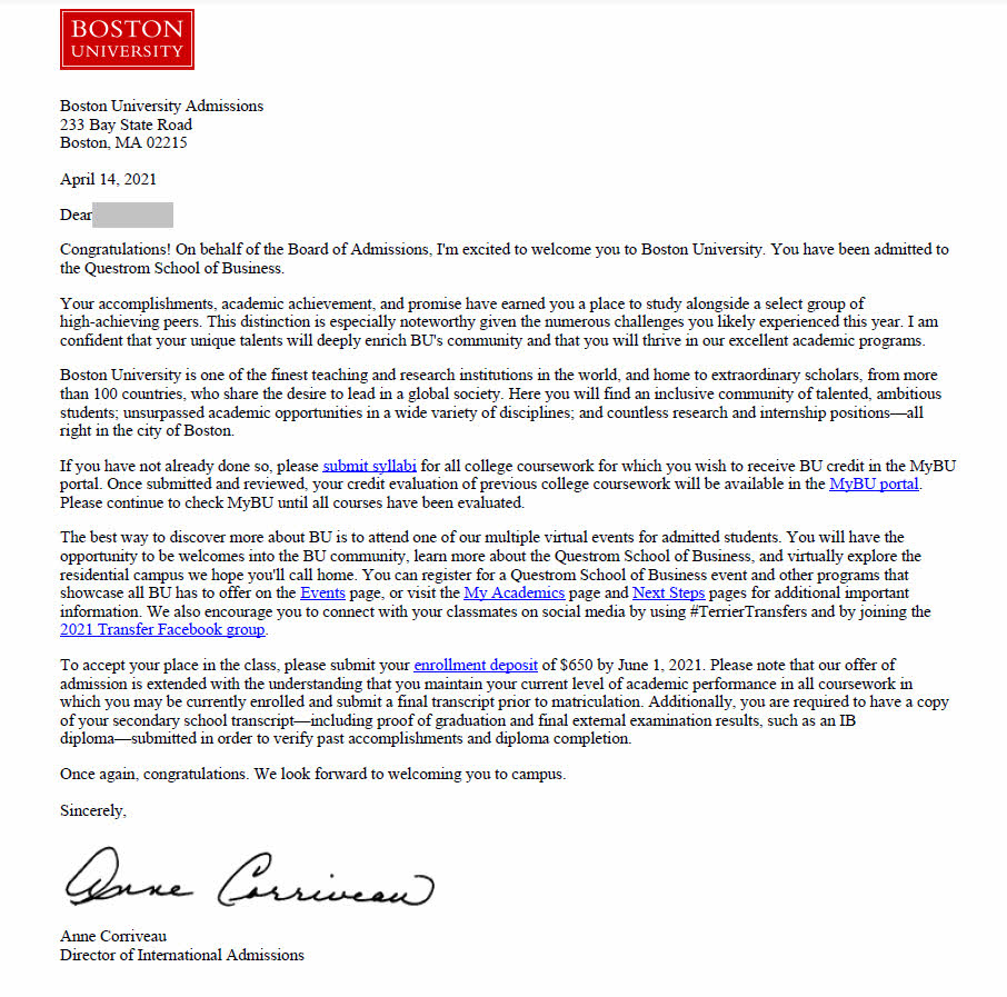 Boston University 경영학과 편입전형에 합격하였습니다. BU 는 전미랭킹 42위의 사립대학교로 경영대학은 44위, 특히 Management 분야는 33위의 높은 랭킹을 유지하고 있는 대학입니다. 합격을 축하드립니다.!