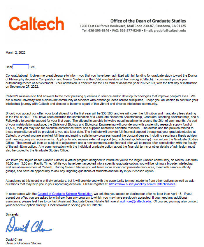 미국 대학에서 Computer Science 를 전공하였고 이번 가을학기에 박사과정으로 지원하게 되었는데요 전세계적으로 인정을 받는 최고의 공과대학 중 하나인 캘리포니아 공과대학 (California Institute of Technology) 에 합격하였습니다.  합격을 축하드립니다.~~