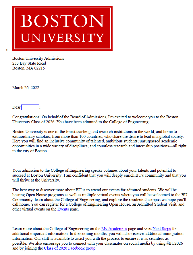 동부의 명문 중 하나인 보스턴 대학교 신입으로 합격하였습니다~ 합격을 진심으로 축하드립니다.!!