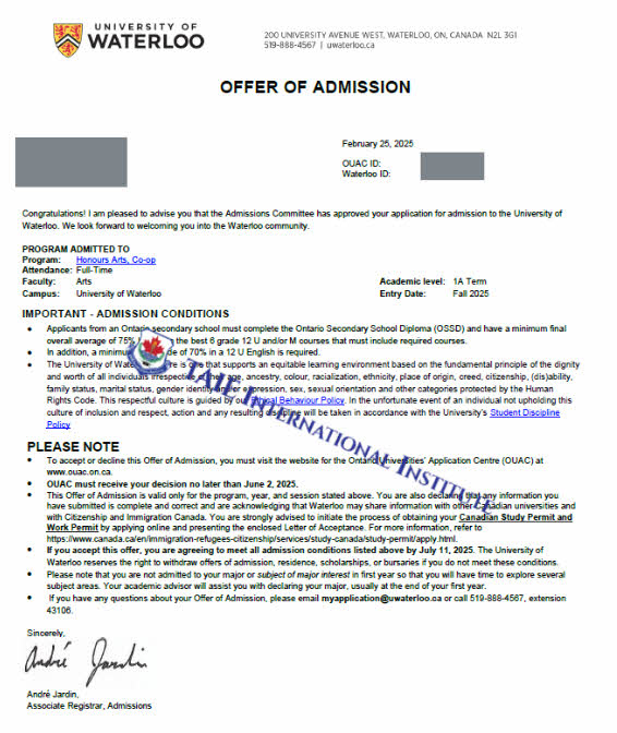 우수한 성적으로 캐나다의 명문 워터루 대학교 ARTS (Co-op) 과정에 합격하였습니다. 학기 중 전공 관련 기업에서 이론과 실무를 함께 경험할 수 있고 ㄱ브여도 받을 수 있어 이력서를 더욱 풍부하게 만들 수 있어 캐나다 학생들에게도 매우 인기 있는 과정입니다. 진심으로 축하드립니다~