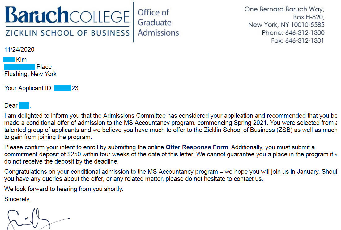 뉴욕시립대학인 Baruch College 의 명문 경영대학인 Zicklin School of Business 의 회계학 대학원 과정에 합격하였습니다.