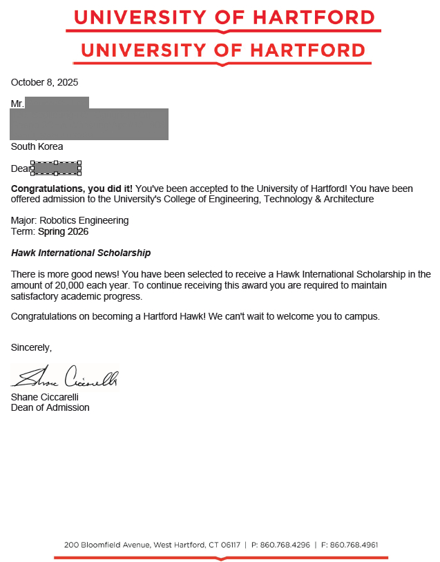 항공 및 기계 공학 분야로 정평이 나 있는 University of Hartford(하트퍼드 대학교)의 Robotics Engineering(로보틱스 공학) 편입 합격을 진심으로 축하드립니다!
