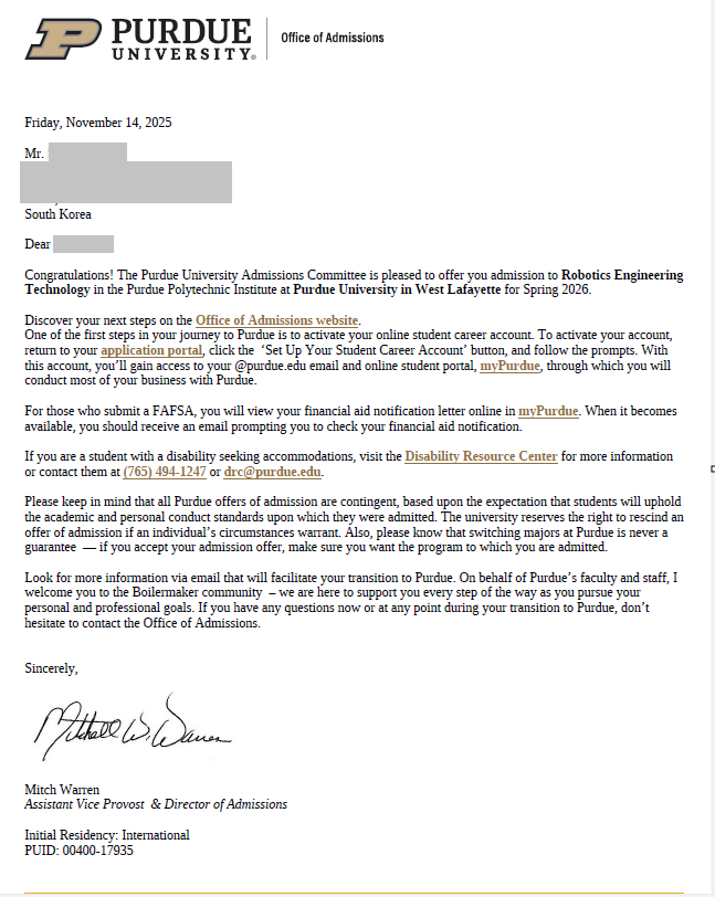 '엔지니어링의 명가'이자 미국 내 최상위권 공대로 손꼽히는 퍼듀 대학교(Purdue University, West Lafayette) 로보틱스 공학 편입 합격을 진심으로 축하드립니다!