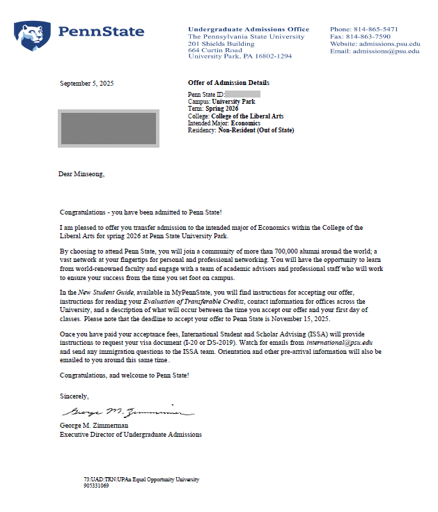 미국 공립 명문, Penn State University(펜실베이니아 주립대학교)의 플래그십 캠퍼스인 University Park 경제학 전공 편입 합격을 진심으로 축하드립니다!