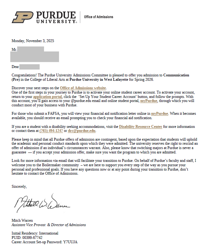2026 봄학기 퍼듀 대학교(Purdue) 본교 커뮤니케이션(Pre) 편입 합격