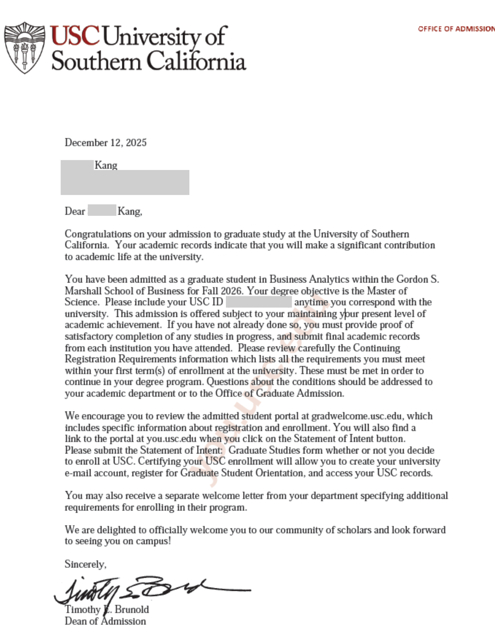 세계 최정상급 랭킹을 자랑하는 USC Marshall School of Business에 합격하셨습니다.