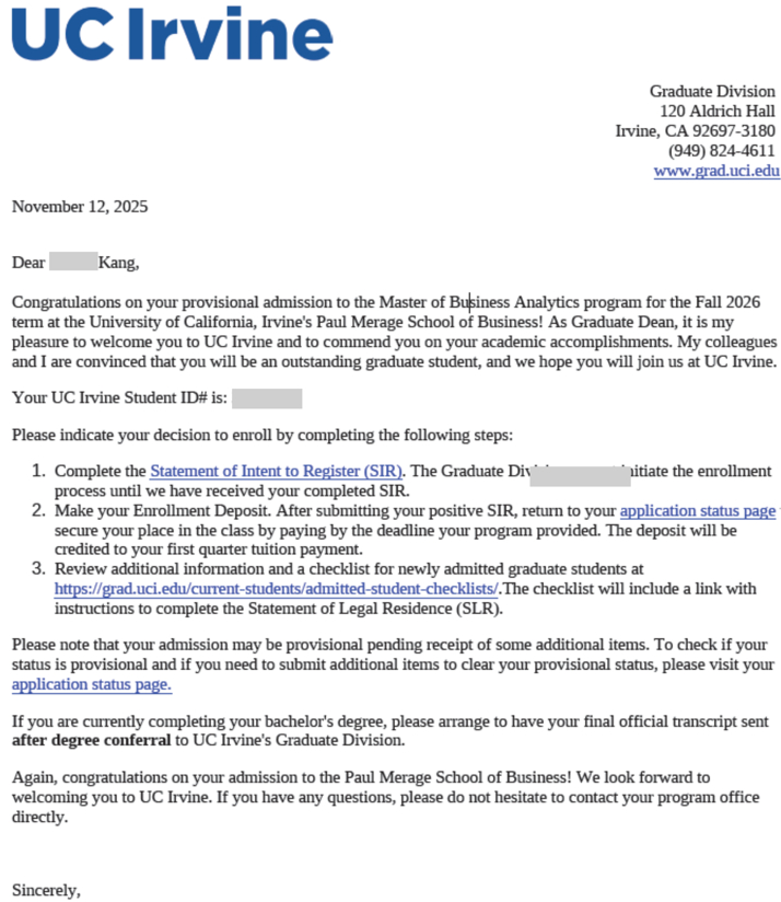 미국 서부의 실리콘 오차드(Silicon Orchard)로 불리는 얼바인의 심장, University of California, Irvine (UCI)의 2026년 9월 학기 석사 과정 전형에서 강*민님이 최종 합격의 영예를 안았습니다.