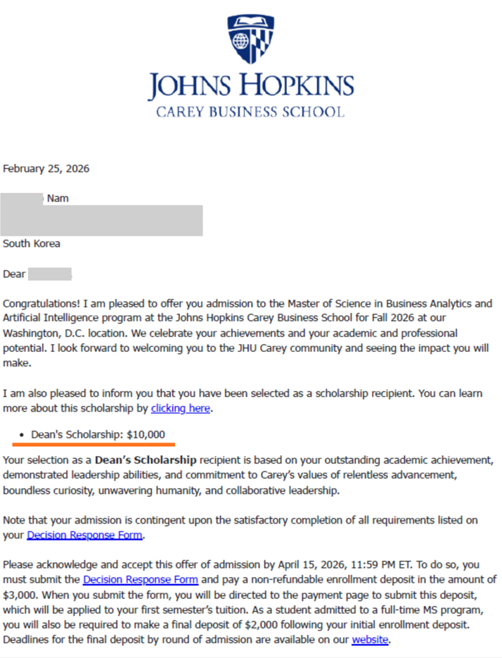 특히 남*서님은 학업적 우수성과 리더십 잠재력을 인정받아 $10,000의 Dean's Scholarship 대상자로 선정되었습니다. 이는 존스홉킨스가 추구하는 가치에 부합하는 인재임을 공식적으로 입증받은 매우 가치 있는 성과입니다.