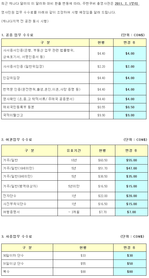 [캐나다] 영사민원 업무 수수료 조정 안내 (7/1 부터 적용)